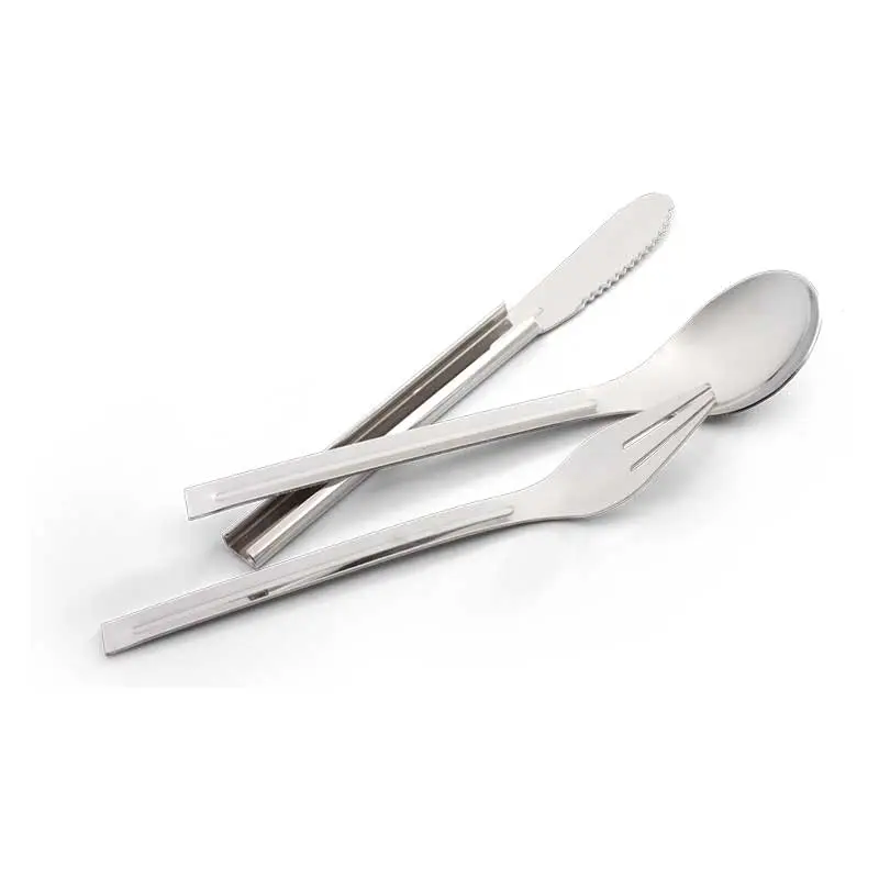 Bằng thép không gỉ ba mảnh gồm dao, muỗng và nĩa. Xếp trượt cùng nhau để lưu trữ dễ dàng.
