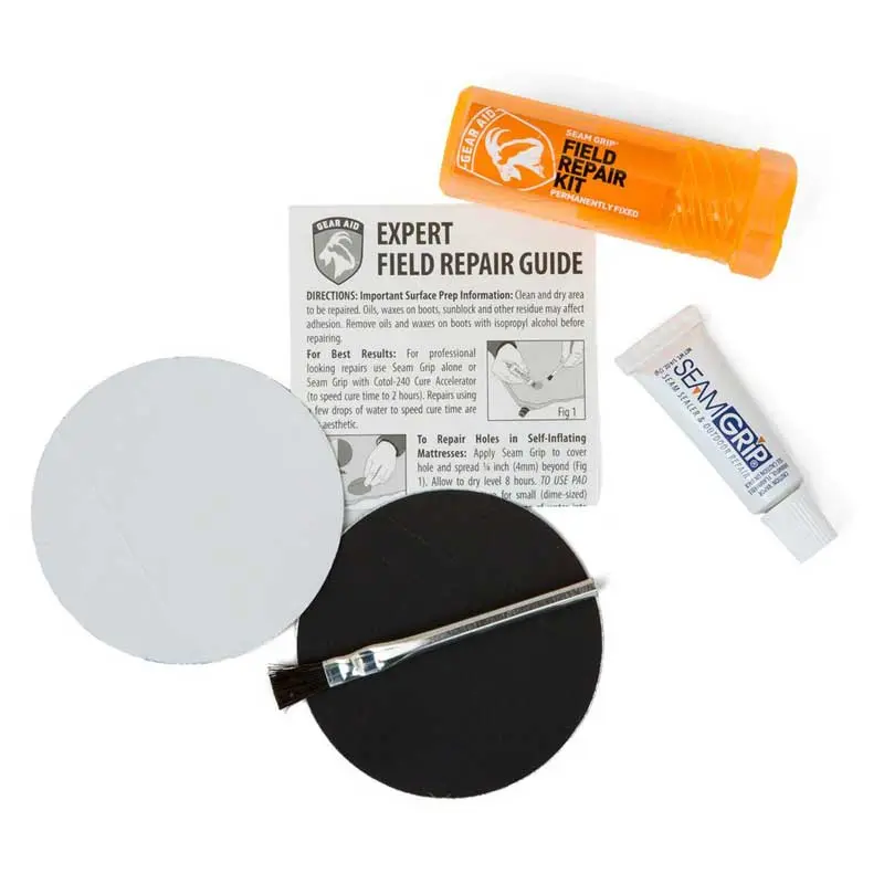 Bộ vá chống thấm Gear Aid Seam Grip Field Repair Kit bao gồm tất cả các công cụ cần thiết để sửa chữa. Dùng bịt kín đường may hoặc vá các lỗ thủng và bị rách trên lều và các dụng cụ cắm trại khác bao gồm nệm hơi và đệm ngủ. Bộ dụng cụ sửa chữa nhỏ gọn này bao gồm một tuýp keo chống thấm nước và hai miếng dán.