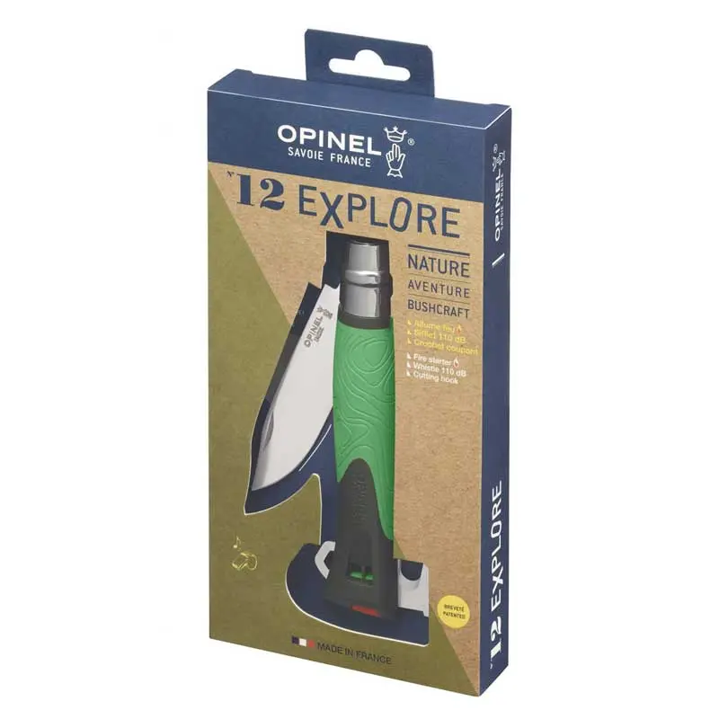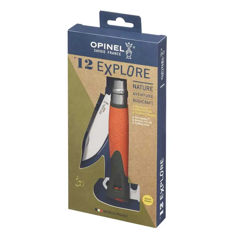 Dao sinh tồn Opinel No.12 Explore kết hợp những phẩm chất của một con dao săn và sinh tồn. Với tay cầm làm bằng nhựa polyamide, có còi, móc cắt dây và bộ đánh lửa. Con dao này đã trở thành vật dụng thiết yếu cho bất kỳ loại hoạt động thử thách với tự nhiên nào.