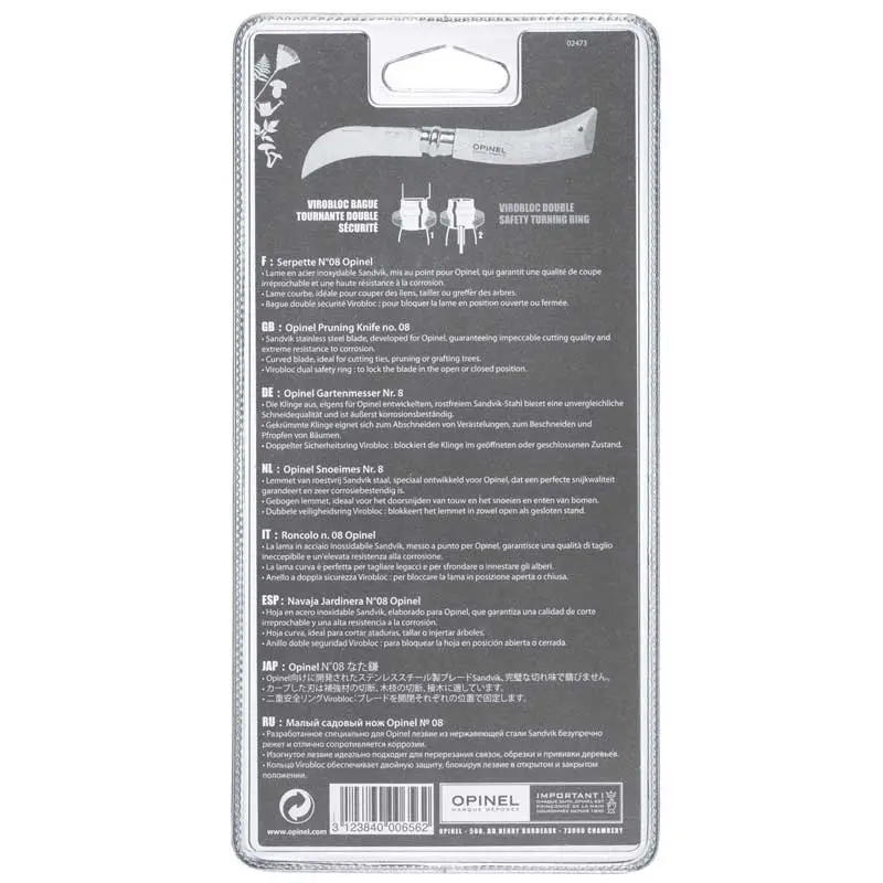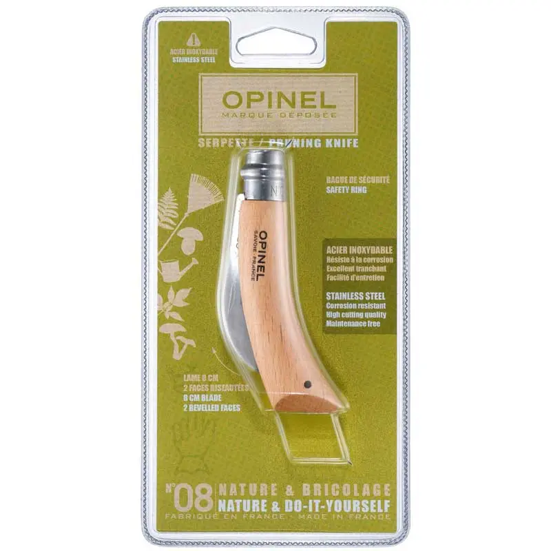 Dao tỉa cây Opinel No.8 Grafting Billhook có thể ghép cành, cắt tỉa cây. Lưỡi cong nhẹ của nó cũng thích hợp để hái hoa và quả.
