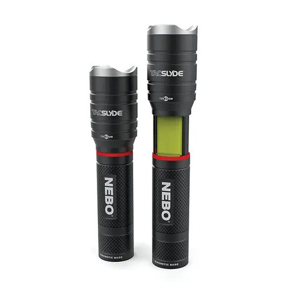 Đèn pin Nebo Tac Slyde 300 Lumens là cây đèn kết hợp giữa đèn pin cầm tay và đèn lồng. Cường độ sáng 300 lumen với zoom điều chỉnh 12 lần và 5 chế độ ánh sáng. Kết hợp tính năng đèn lồng trang bị công nghệ Led C • O • B với 3 chế độ ánh sáng, bao gồm chế độ khẩn cấp flash đỏ. Một đế từ tính hút rất mạnh mẽ để chiếu sáng rảnh tay cực kỳ tiện lợi. và dây buộc tiện dụng giúp giữ đèn chắn chắn trong tay.