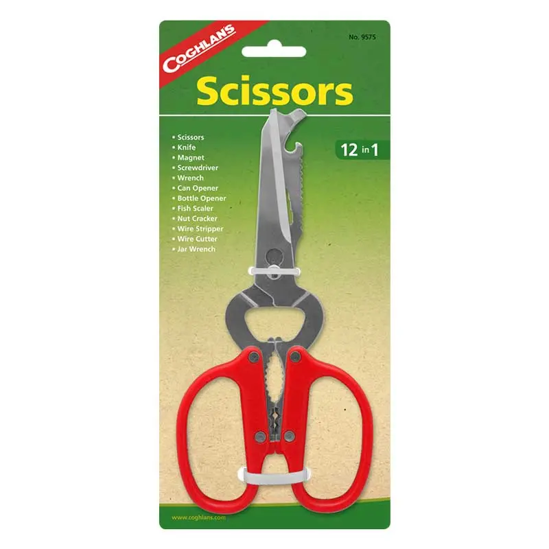 Kéo đa năng Coghlans 12-in-1 Scissor bằng thép không gỉ. Bao gồm 12 chức năng hữu ích: kéo, cắt dây và dao tước, dao, tuốc nơ vít, nam châm, dụng cụ mở lon, cờ lê, chìa vặn lọ, dụng cụ đánh vảy cá, bẻ đai ốc và mở nắp chai.
