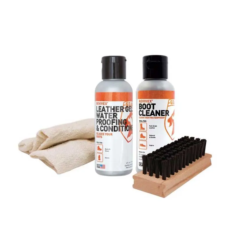 Kit chăm sóc Giày da thuộc Gear Aid Revivex Leather Boot Care Kit. Trải nghiệm ngoài trời sẽ tuyệt hơn với bàn chân khô thoáng. Trước khi đi cắm trại hoặc leo đồi ], hãy sử dụng Revivex Leather Boot Care Kit. Bộ dụng cụ chăm sóc giày da thuộc này sẽ làm sạch và chống thấm tất cả các loại giày da. Bộ sản phẩm được thiết kế để chuyên chăm sóc da thuộc (full-grain leather) – giúp dễ dàng chống thấm giày mới và phục hồi giày cũ. Chất chống thấm nước dạng gel đi kèm thấm vào trong da, cho một giải pháp công nghệ cao thẩm thấu sâu để chịu mưa, vũng nước và bùn. Nó cũng tối đa khả năng thở, vì vậy nó cũng rất tốt cho giày GoreTex.