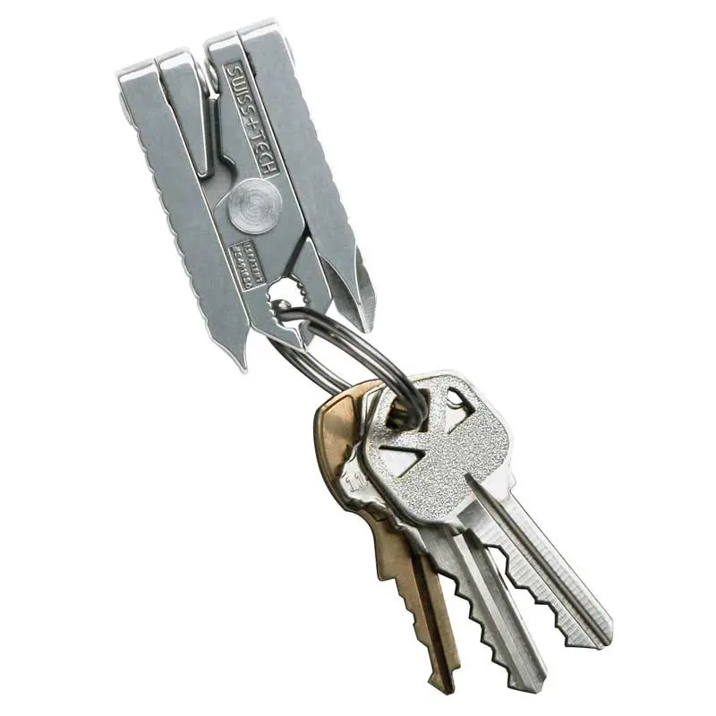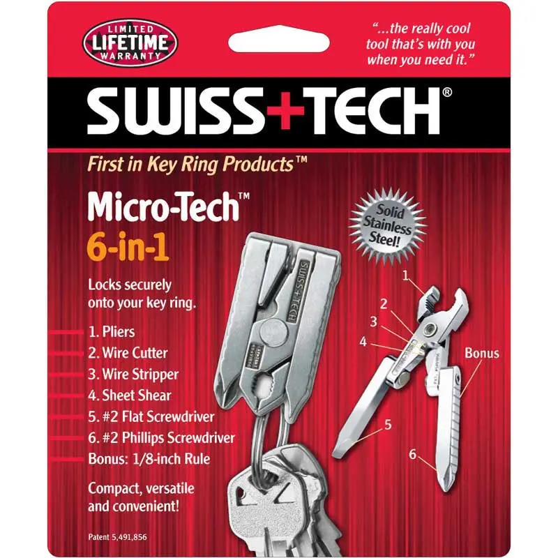 Móc chìa khóa Swiss+Tech Micro-Tools Micro-Tech 6-in-1 là dụng cụ đa năng nhỏ ban đầu đã gây bão trên toàn quốc! Công cụ 6 trong 1 được chế tạo chính xác và bền bỉ này bao gồm kìm, dao cắt dây, dao tước dây, lưỡi cắt tôn, và cả tua vít Phillips và tua vít dẹt và chỉ nặng 45 gr. Công cụ Swiss+Tech này giúp cho việc sửa chữa nhỏ, lắp ráp, cài đặt và hàng trăm công việc trở nên dễ dàng. Các hàm tự khóa tháo nhanh đã được cấp bằng sáng chế giữ cho dụng cụ này được cố định chặt chẽ vào bất kỳ vòng chìa khóa nào. Với việc xoay chân xuống nhanh chóng, nó sẽ được đưa ra sử dụng. Công cụ edc này rất tiện lợi trên đường đi và ở nhà!