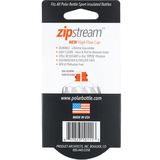 Nắp Zipstream có van tự hàn kín. Thiết kế ngăn chặn rò rỉ ngay cả ở vị trí mở, và cho phép chịu áp lực để vắt hay bóp bình nước giúp đẩy nước ra nhanh hơn. Phù hợp cho tất cả các loại bình nước giữ nhiệt thể thao Polar Bottle Sport Insulated Bottle 0.35L (12oz), 0.59L (20oz), 0.71L (24oz).