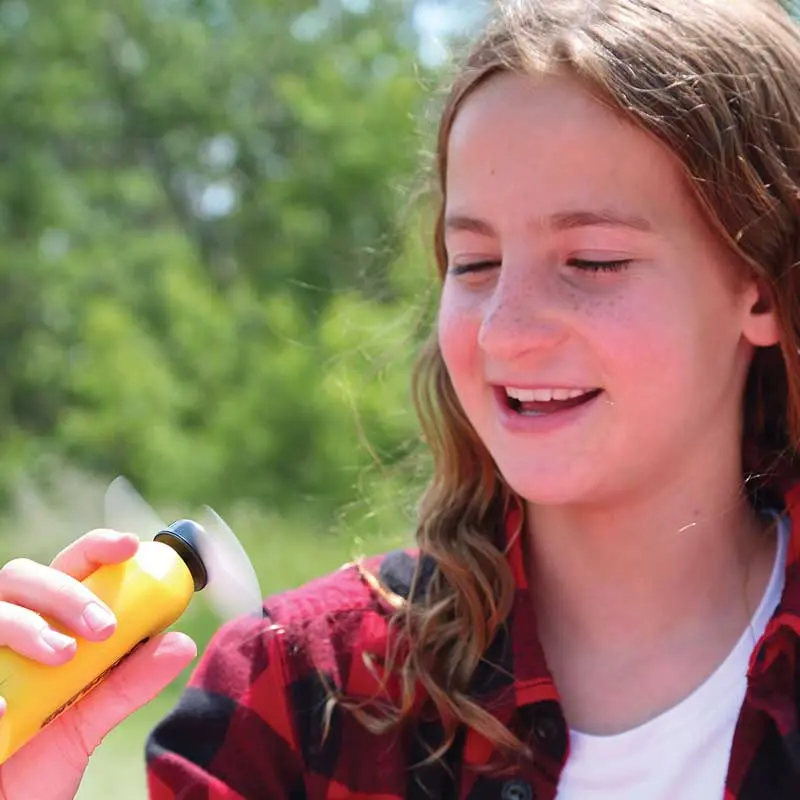 Quạt pin du lịch Coghlans Mini-Fan hoạt động bằng pin AA. Có các cánh bằng bọt xốp để đảm bảo an toàn và có thể di động, lý tưởng để nhét trong túi, gói hoặc ví khi đi du lịch dã ngoại