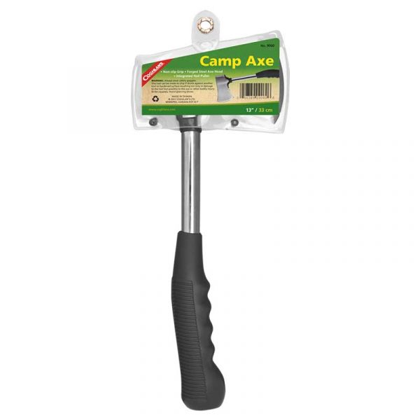 Rìu dã ngoại Coghlans Camp Axe có một đầu thép rèn và một trục thép có tay cầm chống trượt. Phần khía tiện dụng ở đầu rìu cho phép tháo đinh nhanh chóng.