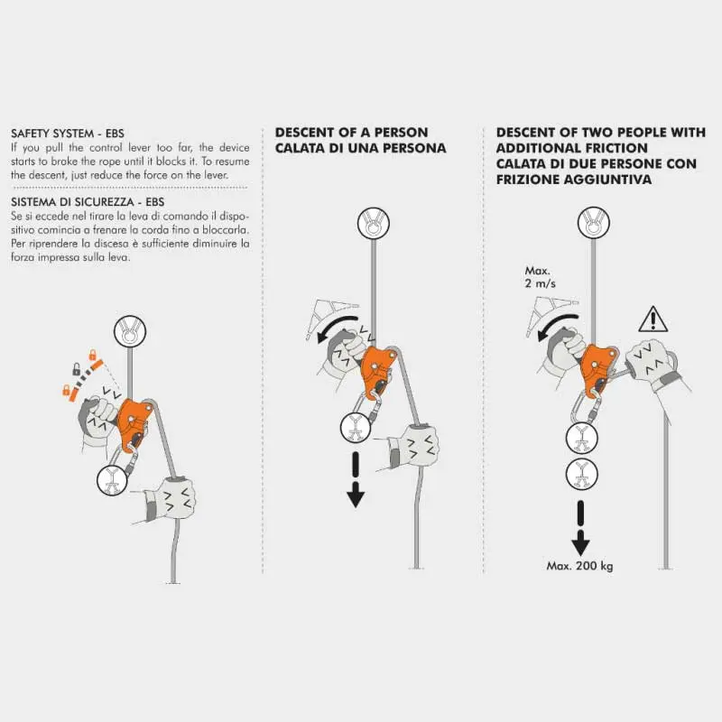 Nó cho phép người vận hành hạ xuống trên hệ thống dây làm việc, định vị mình trên dây làm việc và đi lên an toàn trên cùng một sợi dây.